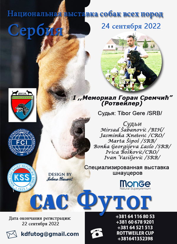 U ime KD FUTOG iz Futoga, pozivamo vas na 2. Nacionalnu izložbu pasa svih rasa CAC Futog 24. septembra 2022. Na istom mestu se održava 1. Rotvajler kup ,,Memorijal Goran Sremčić” (sudija Tibor Gere /SRB/), kao i mini specijalka za šnaucere.