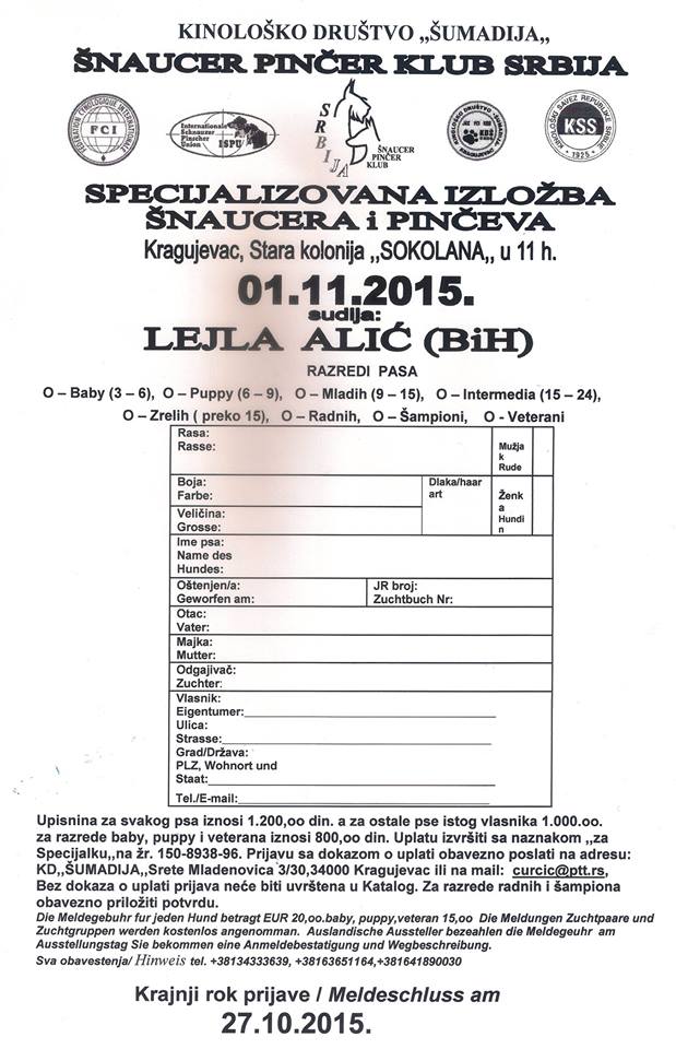 Dana 01.11.2015. godine, Kinološko društvo ,,Šumadija” organizuje Nacionalnu izložbu pasa svih rasa kao i Specijalizovanu izložbu za šnaucere i pinčere.